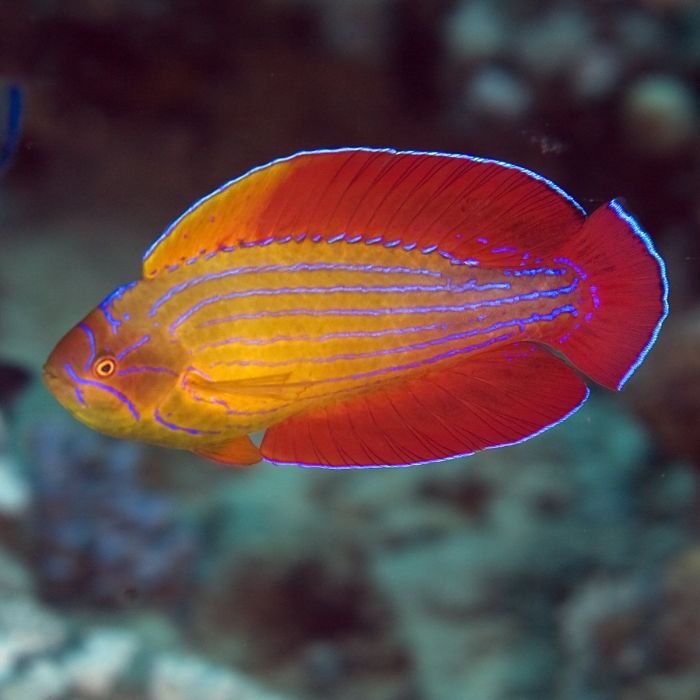 The Eightline Flasher Wrasse, also known as the Eight-line Fairy Wrasse, originates from the waters of the Red Sea. The Eightline Flasher Wrasse is a remarkably colored wrasse featuring different hues of yellow, orange and red. The distinguishing feature of this fish are the eight striking blue lines that run horizontally along the length of the fish. The color of the female is subdued when comparing it to the brilliance of the male. The male during courting will display its brilliantly colored fins in an attempt to persuade its mate. Colors may vary depending on the fish's mood.