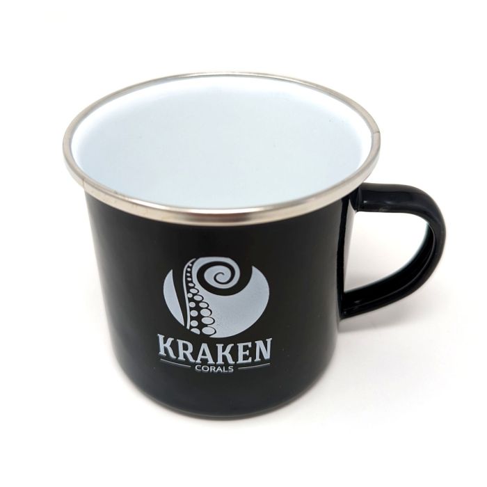 Vintage style enamel mug sporting our very own Kraken Corals Logo, Comes with a box so makes an ideal gift.